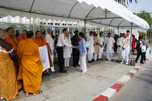 When we arrived at the UNFCCC venue on the last day of the inter-sessional and the Thai head of the UN security crew said – with a big smile – “Hello Sir, ice cream, good idea”, we got a sense that the week was somewhat short of other highlights. And while it’s nice to know that we might have contributed to one of the biggest, we would have preferred the negotiators to create the highlights at this meeting. This desire for progress towards a safe climate future was also the theme of a prayer this morning at UNESCAP, when several dozen Buddhist monks, Hindu Brahman Priests, Sikh leaders, meditators and lay people of many religions and spiritual orientations gathered. They conducted a ceremony to express support for those who have suffered and died from flooding in the South of Thailand and other climate related disasters around the world, and to offer their prayers and aspirations for the governments negotiating inside to take quick action to ensure a safe future. The ceremony was joined by UNFCCC Executive Secretary Christiana Figueres who tearfully expressed thanks for their presence and acknowledgement of their requests, accepting a copy of the Interfaith Declaration on Climate Change that she indicated would be hung in her office. More information can be found at: www.interfaithdeclaration.org