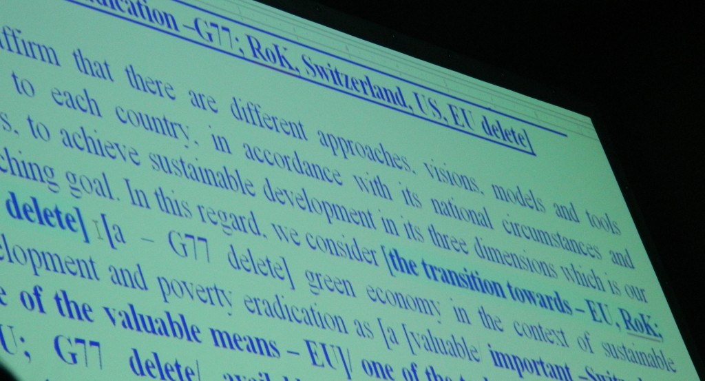 Acompanhei uma das sessões, sobre economia verde. Já haviam me contado como essas negociações funcionavam. Difícil de acreditar que se estuda intensamente com o objetivo de ingressar na carreira diplomática para, então, discutir sobre vírgulas e sinônimos. Na foto acima, vemos a intervenções de cada país/grupo de países na sessão “Green economy in the context of sustainable development and poverty eradication” (economia verde no contexto do desenvolvimento sustentável e erradicação da pobreza” do documento “O Futuro Que Queremos”, que deve ser um dos resultados da conferência oficial. Pela quantidade de encontros (este é o terceiro), vemos como é difícil chegar a um consenso sobre quais palavras usar. Até amanhã, uma versão mais final - talvez nem tanto, se não houver consenso - deve estar pronta para ser submetida aos líderes mundiais.