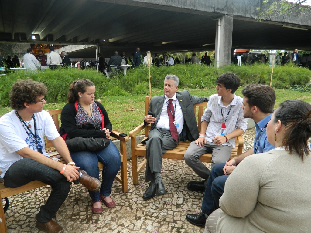 Ontem foi o segundo dia das negociações com os líderes de estados na Rio+20. Eu e outros quatro jovens tivemos uma conversa interessante com o senador Rodrigo Rollemberg (PSB-DF), presidente da comissão de meio ambiente do senado, sobre o processo da Rio+20 e seu resultado, a questão energética no Brasil e como os jovens podem estar mais envolvidos no processo decisório. Para Rollemberg, não se discute a raiz do problema e tudo que tinha de ser negociado já aconteceu e agora os países apenas cumprem protocolo. “Eu acho que o documento não vai ser modificado. Ele já foi consensuado pelas equipes técnicas. Os chefes de estados e de governo já aceitaram, muitos deles já viajaram. E agora a conferência cumpre um rito protocolar meramente.”