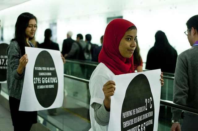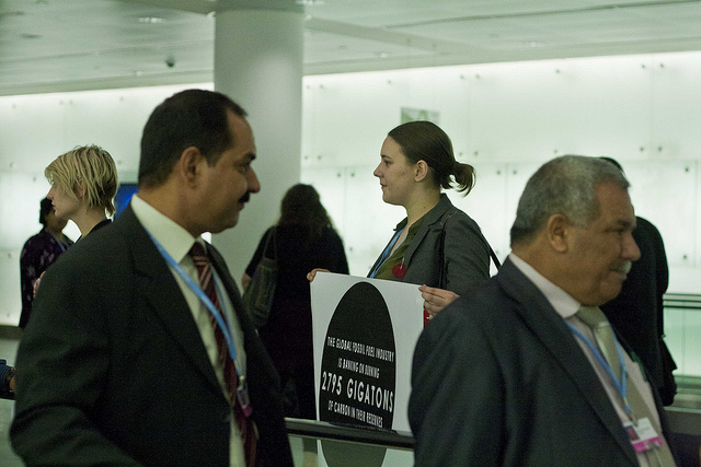 Early this morning youth from around the world lined the moving sidewalks that carry negotiators from security checkpoints into the plenary halls of the 18th round of United Nations climate talks. Thus far fingers have been pointed at a number of different countries for blocking progress toward a meaningful international agreement on reducing greenhouse emissions to levels that would minimize disruption of the climate system and subsequent threats to people and property. The youth demonstration this morning sought to point out an important character operating behind the scenes, multinational fossil fuel corporations.