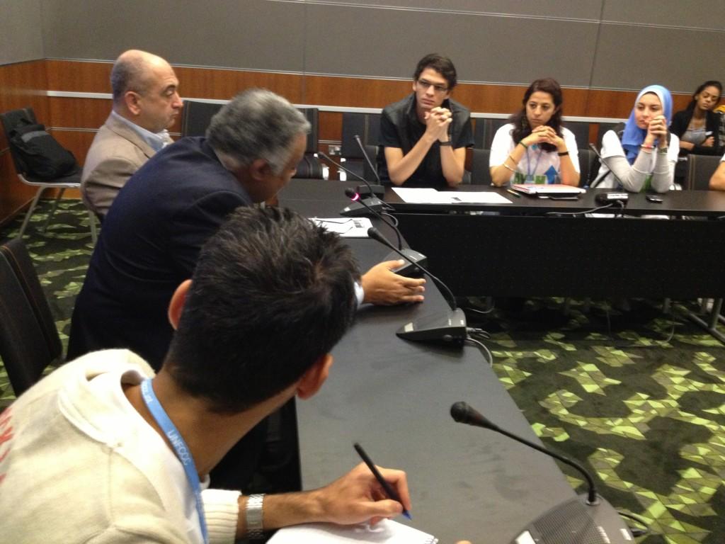 و اشار الي اهميه دور الشباب في الضغط على الحكومات حتى لا ينحرفوا عن مسار المفوضات عن البيئه و التغير المناخي الي المفوضات السياسيه و الاقتصادية –التي تأخذ الكثير من الوقت- و تكلم عن دور الدول المتقدمه في مساعده الدول الناميه من حيث نقل التكنولوجيا و دفع مصاريف المشاريع التي تختص التكييف مع اثار التغير المناخي. و اشار الي مؤتمر ريو سنه 1992 الذي قررت فيه الدول الاعضاء في الامم المتحده ان على ان الدول المتقدمه عليها نقل التكنولوجيا الي الدول الناميه حينما تكون في متناول القطاع العام و اذا كانت ملك للقطاع الخاص في الدول المتقدمه فعلى حكومه هذه الدول شراء هذه التكنولوجيات و بيعها للدول الناميه باسعر زاهيده حتي يتثنى لها شرائها و الاستفاده منها في مشكله التكيف و تخفيف الانبعثات او امداد صندوق التمويل الاخضر بالاموال التي بدورها سوف تساهم في تدعيم مشاريع محليه في الدول الناميه. و لكن الان تغير الوضع الدولي و تحاول الدول المتقدمه تغير نصوص هذه المعهادة بعد الازمات الاقتصاديه في الولايات المتحدة و الاتحلد الاوروبي الان !!